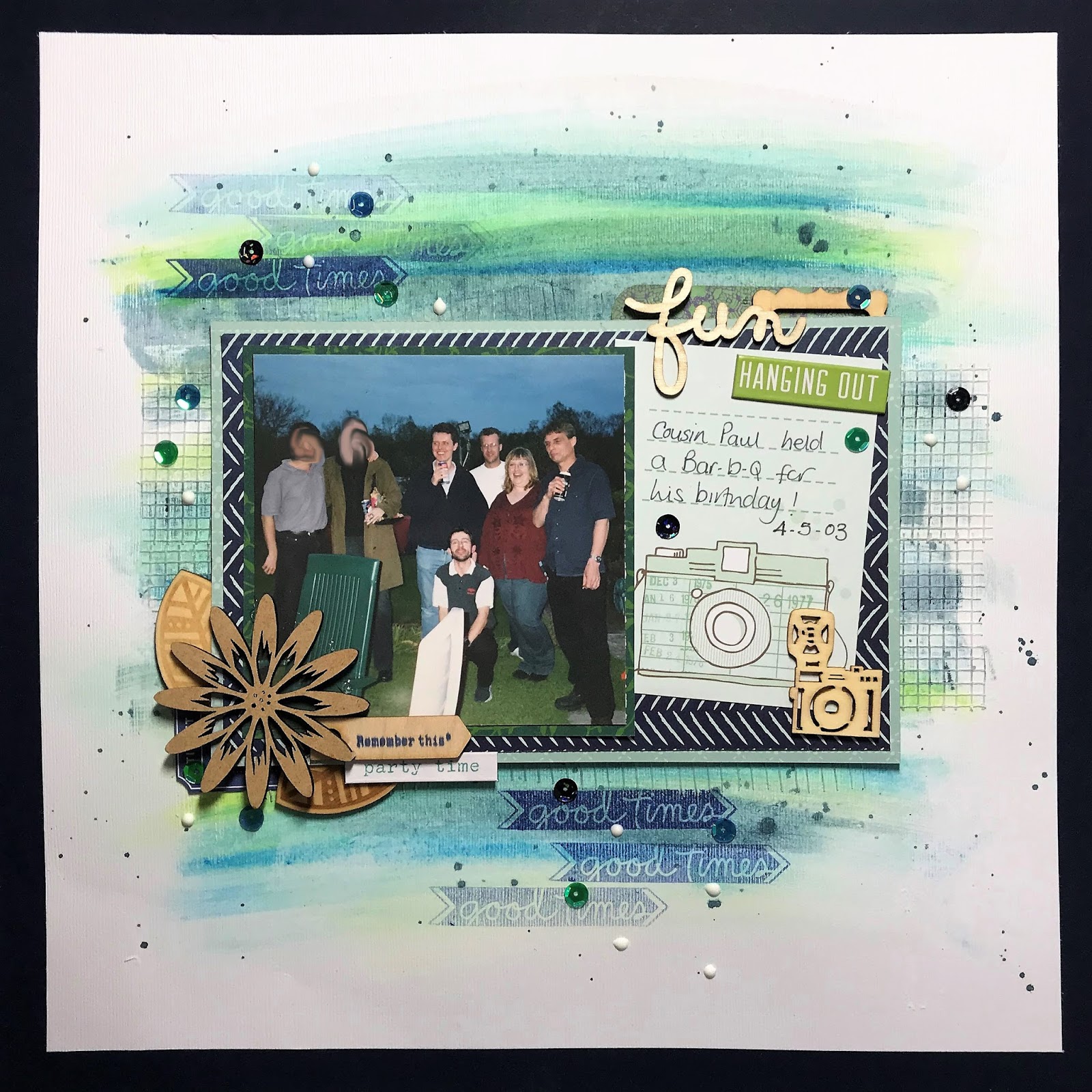 It's been a while since I posted, been a hectic couple of months, but I'm sharing a layout today inspired by a few current challenges. I'm currently working on old photos - this one from a birthday BBQ back in 2003!