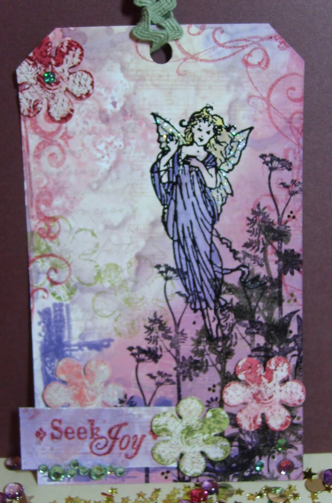I love fairies and this stamp from Personal Impressions is really pretty. The background is made on glossy card by applying distress inks to my craft sheet, spritzing with a little water and 'smooshing' the paper around on it - that's a technical term that! After that I applied distress inks with the applicator and stamped til I was happy. I painted the fairy, added some cut out stamped flowers, the sentiment and some stickles and gems for a little bling. Stamps used were -