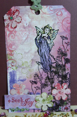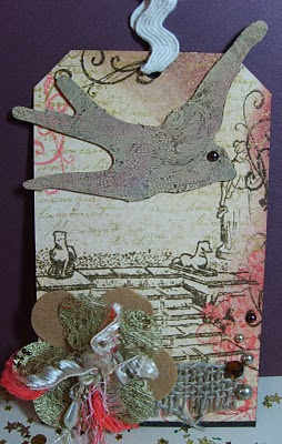 For this tag I used a chipboard shape, painted with scattered straw distress crackle paint and then inked with worn lipstick, aged mahogany and walnut stain, I stamped on it too with a stamp from Elusive Images Butterfly Poppy collage theme plate and I've also used some flowers from this set at the bottom. The other stamps are from Aspect of Designs (Gardening) and Hero Arts. I made the flower from some felt and gold angel paper, the idea for the fibres and beads came from a gorgeous flower made by Annette on her blog (Netty's Craftings) so I hope she doesn't mind me using it.