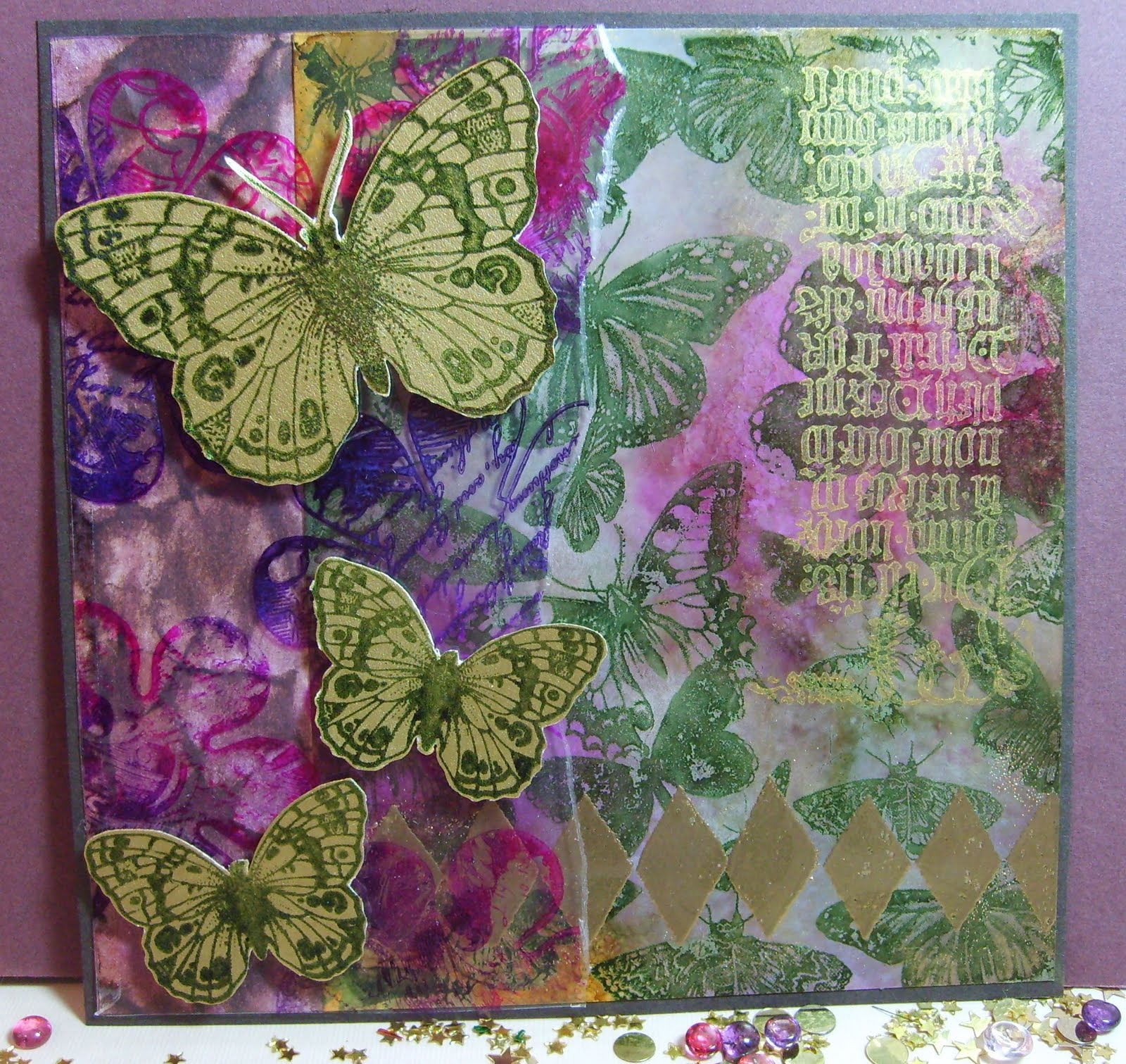 This one is my favourate, I really love how the colours came out. The main background is created with alcohol inks on glossy card, stamped with 'Butterfly Background' by Chapel Road Stamps in Olive Green Stazon. The gold embossed border is a Hero Arts stamp. I've added a torn strip of acetate stamped with flowers from Elusive Images Butterfly Poppy collage theme plate. The cut out Butterflies stamped on gold in Olive green Stazon are from this set also. The final touch was the script also from the Elusive Images set stamped in Gold Stazon (this ink pad is fantastic!!).