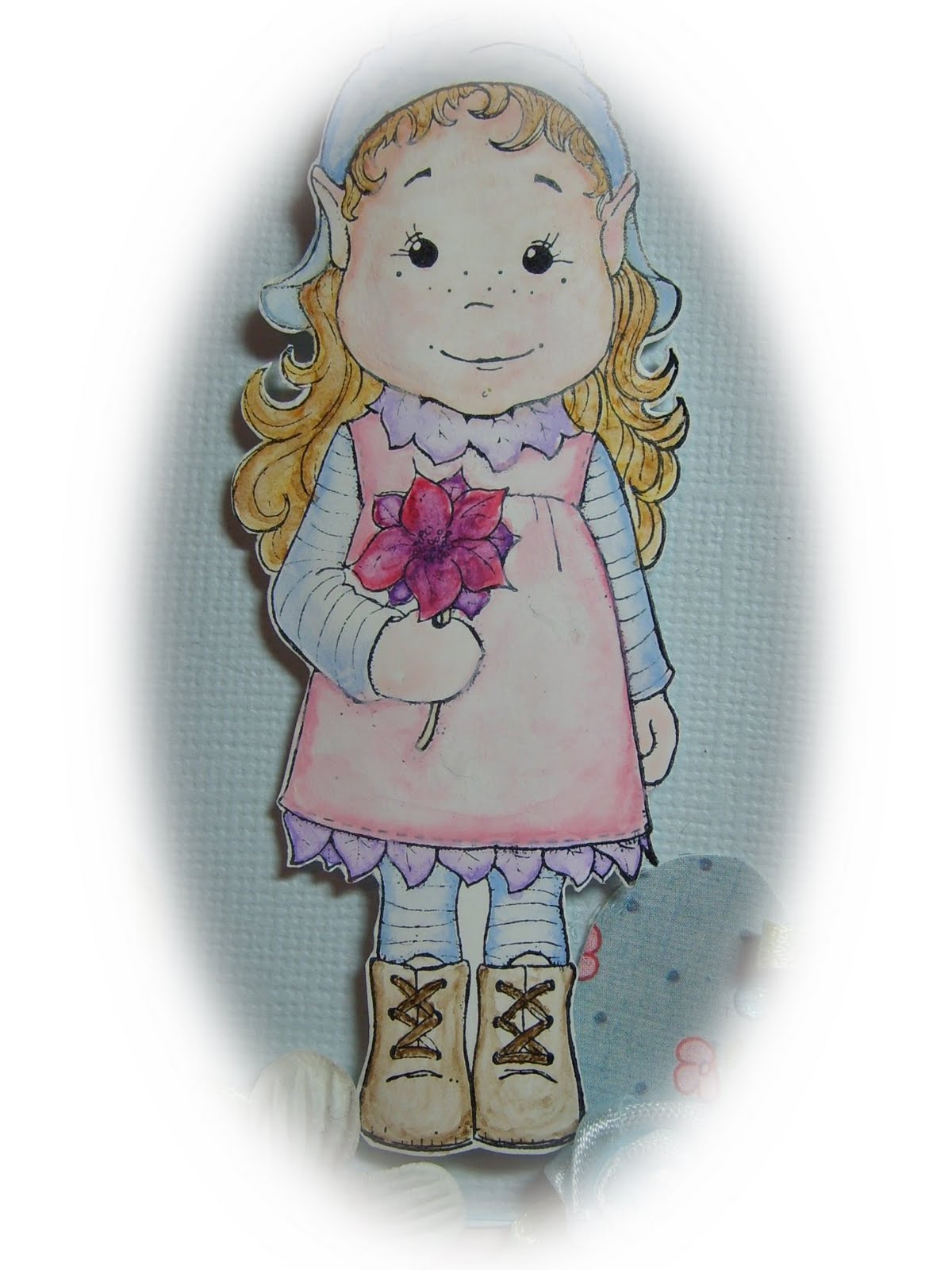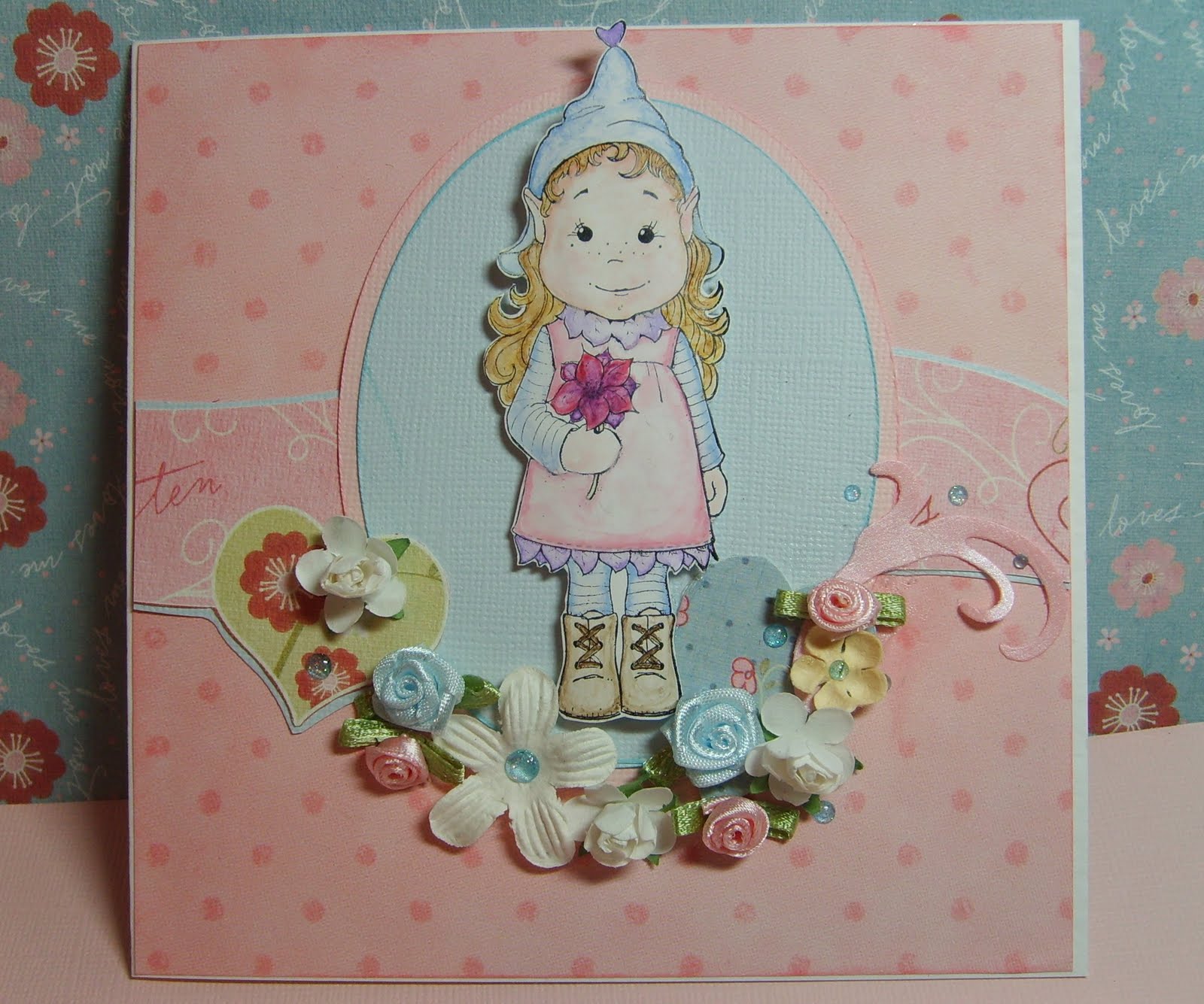 The stamp is Alva with flower and I painted her with water colours (still saving for those copic markers!) and used these colours so I could enter her into the Colour Create Challenge with a baby pink and pastel blue theme.