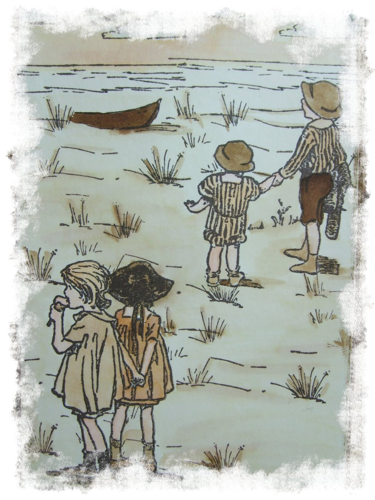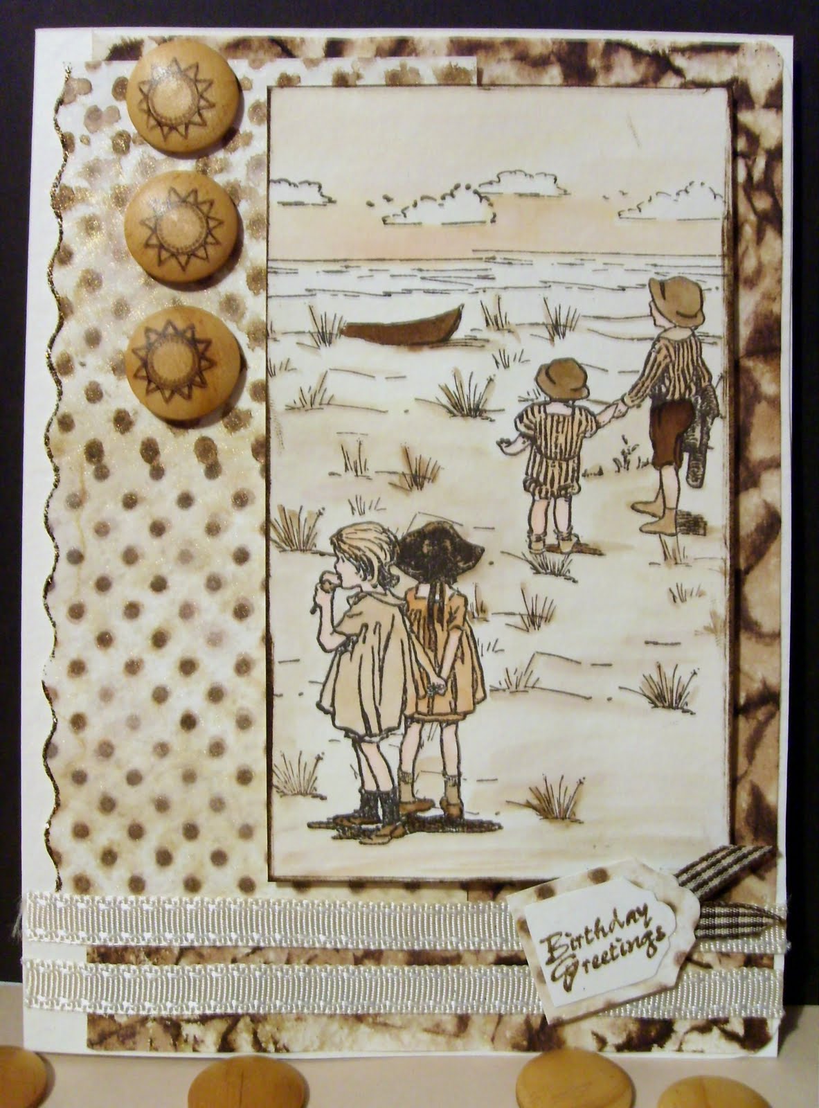 Craftalicious have chosen 'monotone' as their theme, so I've stuck to the brown palette using just two Distress inks - Walnut Stain and Tea Dye. I made both lots of BP - one by 'scrunching and inking and spritzing and ironing' and the other using my favourate Hero Arts Cling 'dots' stamp. The picture is put together with three stamps - the two pairs of children I've had for ages but I think are from rubadubadoo. Having stamped the children I masked them and used Judikins Seashore cube to repeat stamp (using my stamp positioner to guide me) to get the beach. I used the sketch from