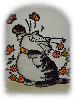 I've used the sketch provided in the Crafters Companion Challenge and cute Penny Black cat stamp - I painted him with water colours and couldn't resist a bit of glitter on his collar ! The damask background is also a Penny Black stamp, which i've embossed. After I'd finished creating I came across the Penny Black Saturday Challenge blog and so have entered that as well as the theme is in the garden which fits just nicely.