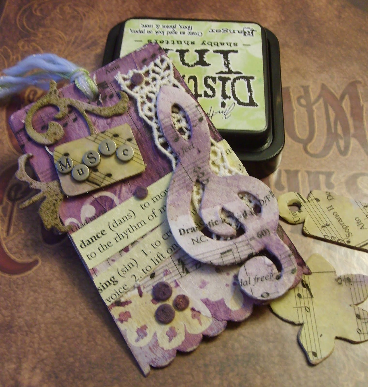 I love music, I dabble a bit on the piano and sing loudly in the car so this is very 'me'. ..especially as purple is my favourite colour too. I used some sheet music I downloaded for free from a website, distress inks (Milled lavender, Dusty concord and shabby shutters) and did a little masking in the bottom left hand corner with some of Tim's masks. The chipboard shapes, definitions stickers and metal letters I've had for ages and can't remember where they're from, the grunge paper swirl is Tim's of course and there's little piece of lace from my stash. I've added some stickles to the dots since taking the pic so please if you could just imagine the sparkle (the dots by the way are the bits that popped out from the holes in my chipboard tags - never waste a thing!).