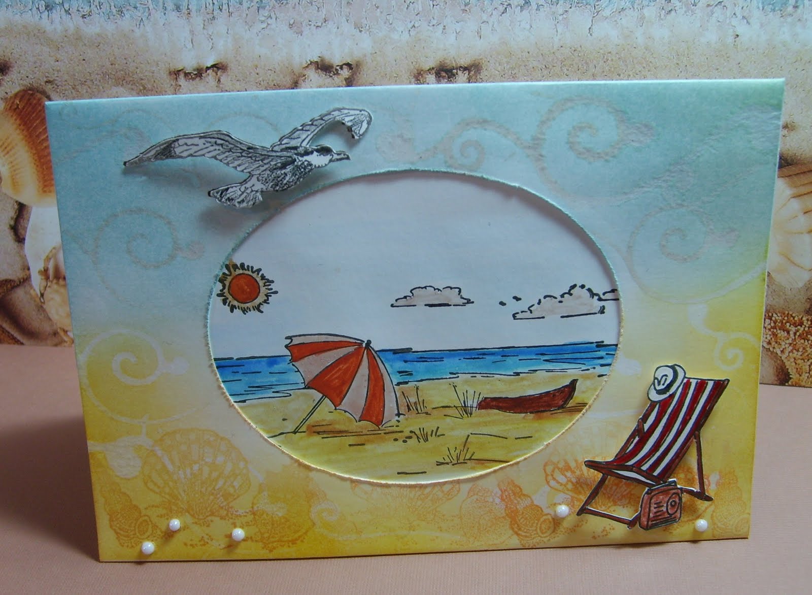 Feeling tired today, which is odd as I've had a very relaxing weekend - maybe it's the heat, and speaking of which seeing as the weather has been so glorious and being inspired by a couple of challenges I thought I'd make a beach card. I've cut an aperture in a three fold card, distressed the edges and added distress inks around the outside. I didn't want to leave it plain though so stamped with a swirl stamp using just water and added some stamped shells - I know they're not Oyster shells but I've added a few pearls too just the same. The main image is painted with twinkling H2O's as is the deck chair.