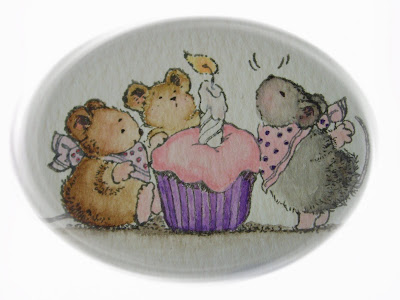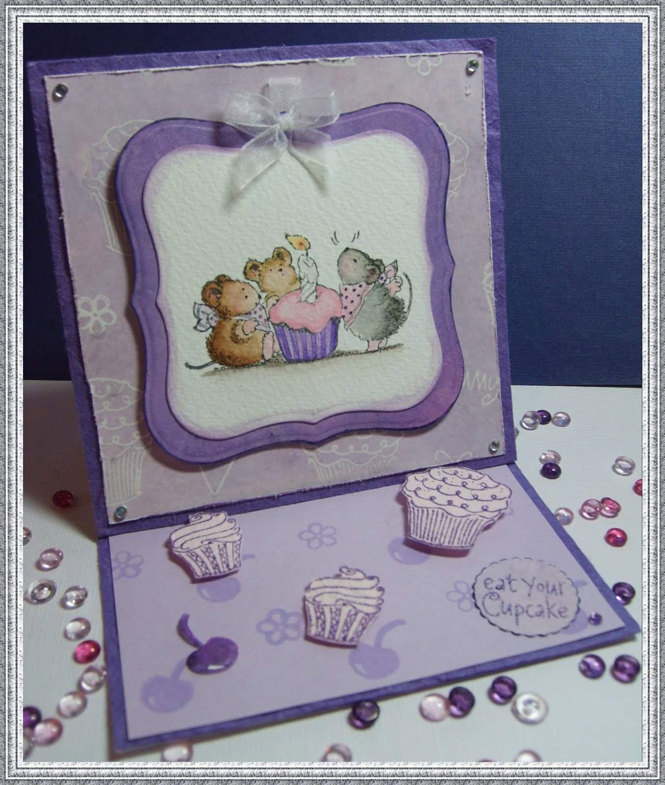 I painted the mice on water colour paper with watercolour paints and used milled lavender, dusky Concorde and spun sugar distress inks to create the border and background papers. For the background paper I stamped with Hero Arts Sparkle Clear – Cupcakes, embossed in clear and then distressed over the top with the inks. I also spritzed with Moonglow Dessert Moon wild iris glitz spritz (blimey that's a mouthful!)but you can't really see that on the photo. I distressed the edge of this piece and mounted on dark purple hand made paper (not hand made by me I might add). A little bow and some crystals finished off the top piece. The bottom piece is just some lilac card matted on more hand made paper, stamped with a cherry from Maya Road - Cupcake singleton and a flower from the Hero Arts set, I then used some cut out stamped images of the Hero Arts cupcakes to hold the easel in place and added the 'Eat your Cupcake' Sentiment from the same set.