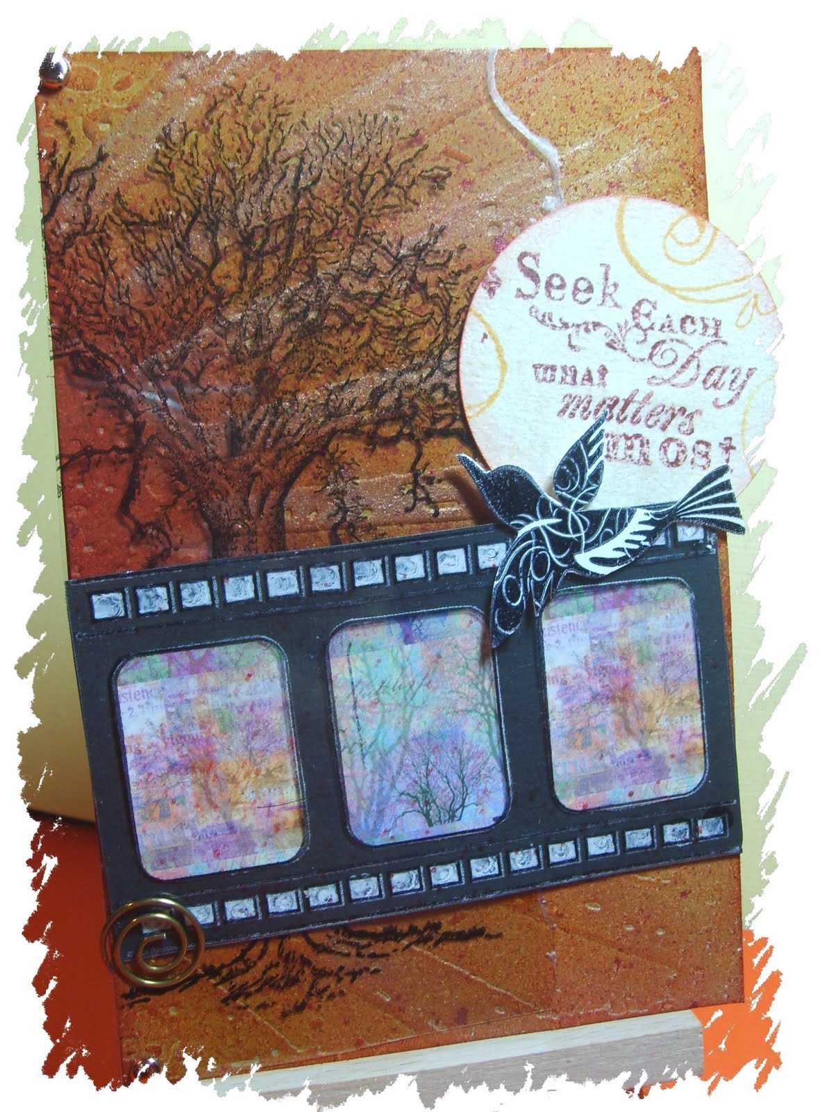 While I had the sunshine coloured Distress inks out - Mustard yellow, Dried marigold, Wild Honey and Fired Brick, I decided to keep going with the grunge and made another piece. I haven't made it into anything yet, but will probably use it for a card. I was trying to go for a sunshine through the tress kid of feel - it looks quite dark on the pic but the colours are lighter and more yellowy orange in real life. I've embossed the grunge paper with Tim Holtz sizzix 'rays' folder and added highlights with some gold metallic rub on. The film strip is an 'Artistic stamper' stamp (which also arrived this morning and had to be used immediately!), I've stamped it onto acetate in black and again onto black card in white in, cut out pics of trees from a crafty individuals pad and layered them together. The tree is stamped on acetate and torn down the right side. I'm going to add this to the Ginger Snaps Creations random redhead Challenge 'Sunshine' - even though it's not bright sunshine (just like our real weather!).