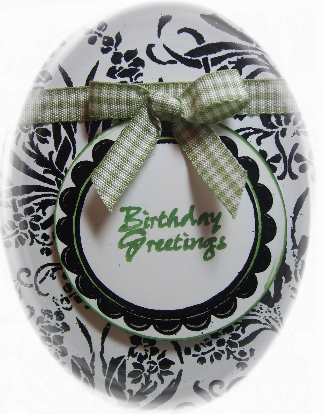 Inspiration didn't come easily for this challenge, which is a colour splash - Black and White with a splash of Green. I've been thinking about it since the theme was announced and finally had an idea while driving between appointments for work today! Only to find that once home and itching to get started things did not run smoothly. Apart from the previously mentioned distractions, I struggled to get a good clear stamping to emboss - though the white embossing looks better than the black and then I couldn't find quite the right colour ribbon, I stamped my circle slightly off, couldn't find the message stamp that is the perfect size for inside the circle so had to use a smaller one, and to cap it all I creased the card slightly off so the bloomin thing doesn't stand striaght (though I've 'wedged' it for the photo).