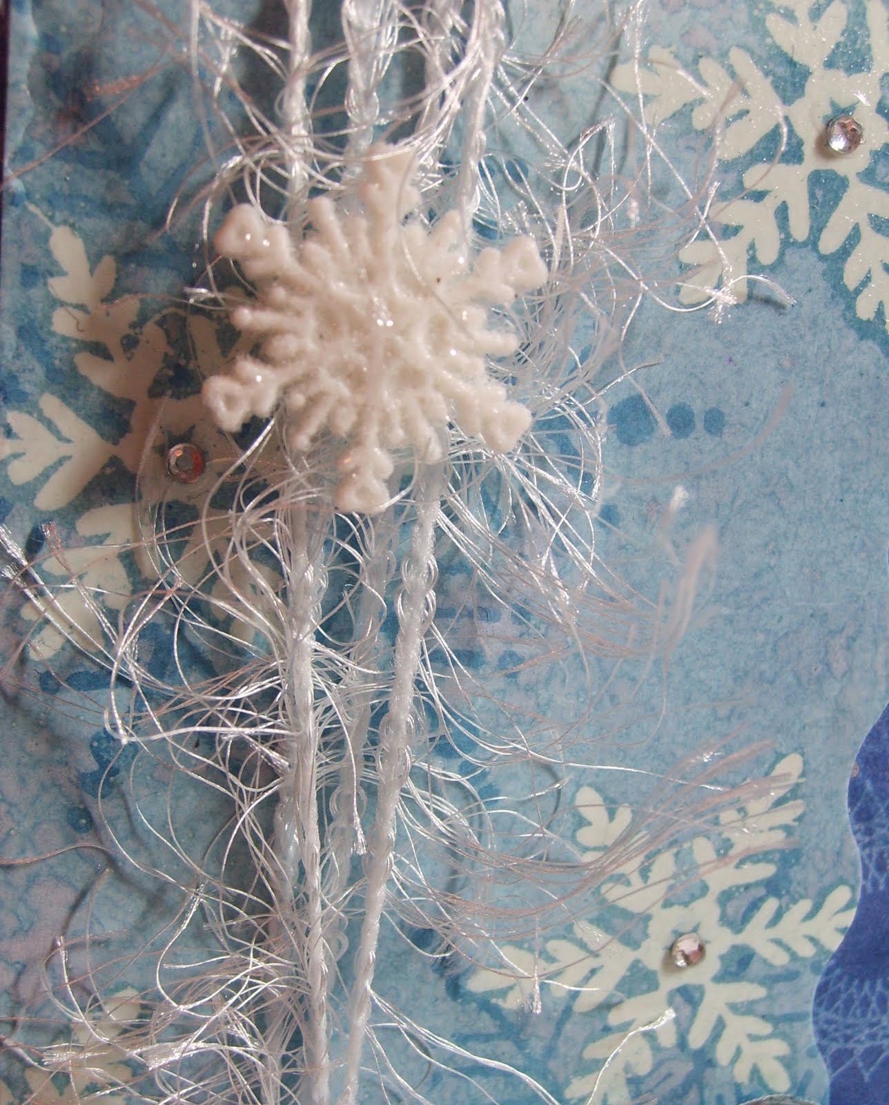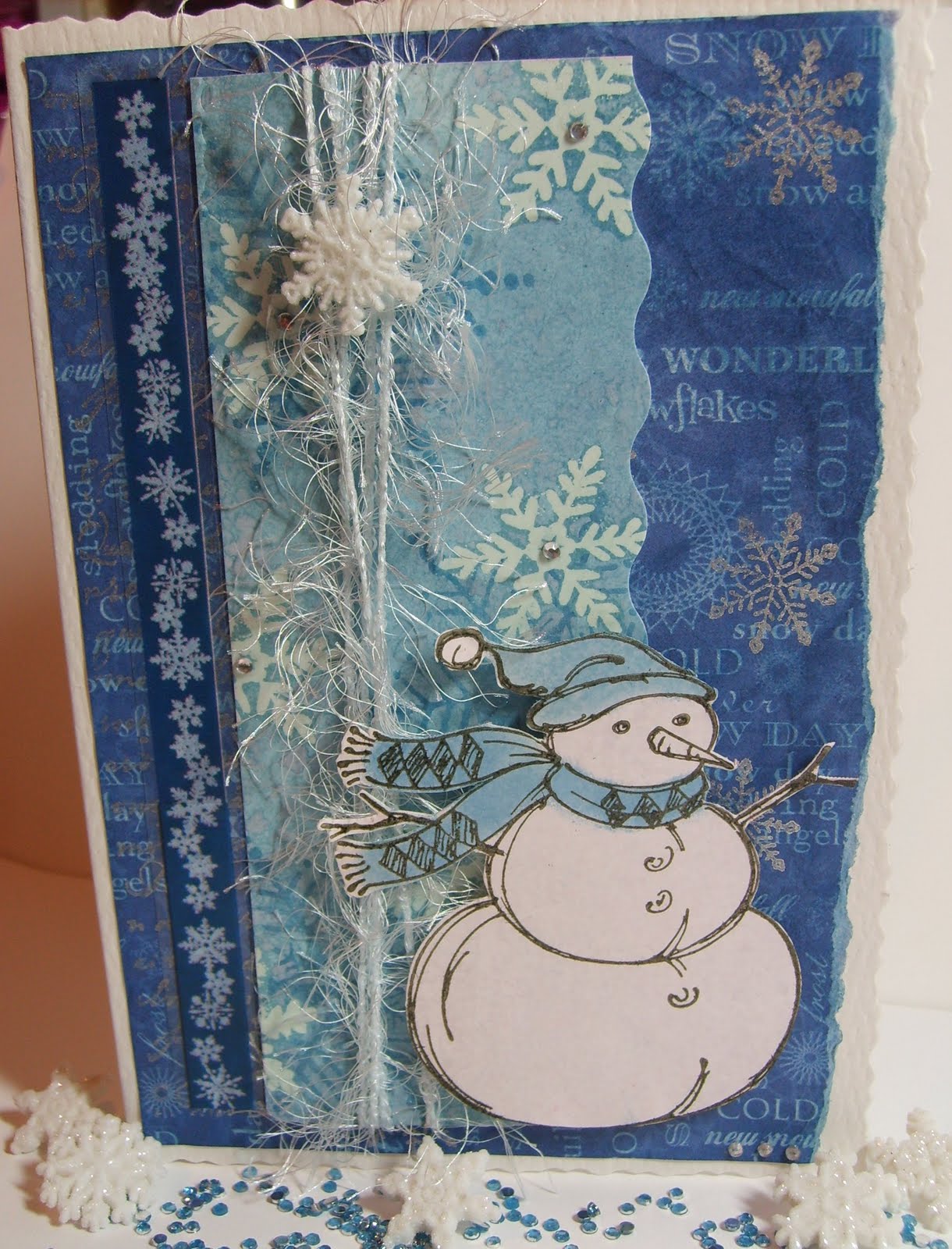 The background paper is from DCWV Christmas Stack, with some distress inks and snowflake stampings added. I wrapped some fibres round my batik paper, which I had over stamped with a PSX snowflake in Faded Jeans and added a snowflake button. This snowman is one of my favourate Christmas stamps, he's called Frankie and is from Judikins. A snowflake border sticker (which I'm not sure about ) and some little gems (which I'm always sure about!!) finished off. I'm also going to enter this at -