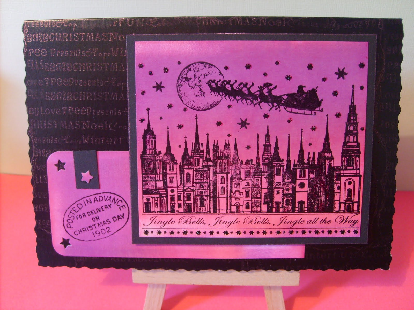 This first one was inspired by the challenge 'come fly with me' at Daring Cardmakers - and who better to have flying across the sky than Santa!! This is a new stamp for me this year from Crafty individuals and I've stamped it onto some card which I'd brayered using a Marvy Blending Block. The card base is stamped with a christmas script stamp using an Opalite ink pad.