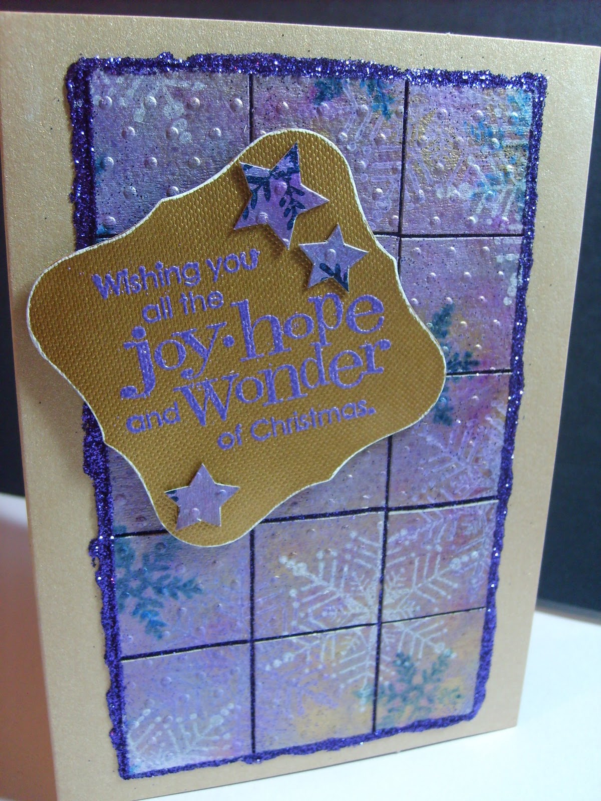 The background is made using the technique on P53 of Tim Holtz's Compendium of Curiosities book, I didn't have all the right materials so used my initiative and substituted the required paint with gesso and watered down liquid pearls which I think worked ok. Can't tell you anymore than that - them's the rules. I chopped the BP up into inchies and stuck onto a double sided adhesive sheet, then added purple glitter to fill in the gaps. After I'd stuck it to my card I added a line of glue round the edge and applied more glitter, it's not very neat but I think this goes with the grungyness of the BP (my desk at this stage would of made for a great WOYWW pic..covered as it was in purple sparkles!). A nestie cut shape and embossed sentiment later and there you have it.