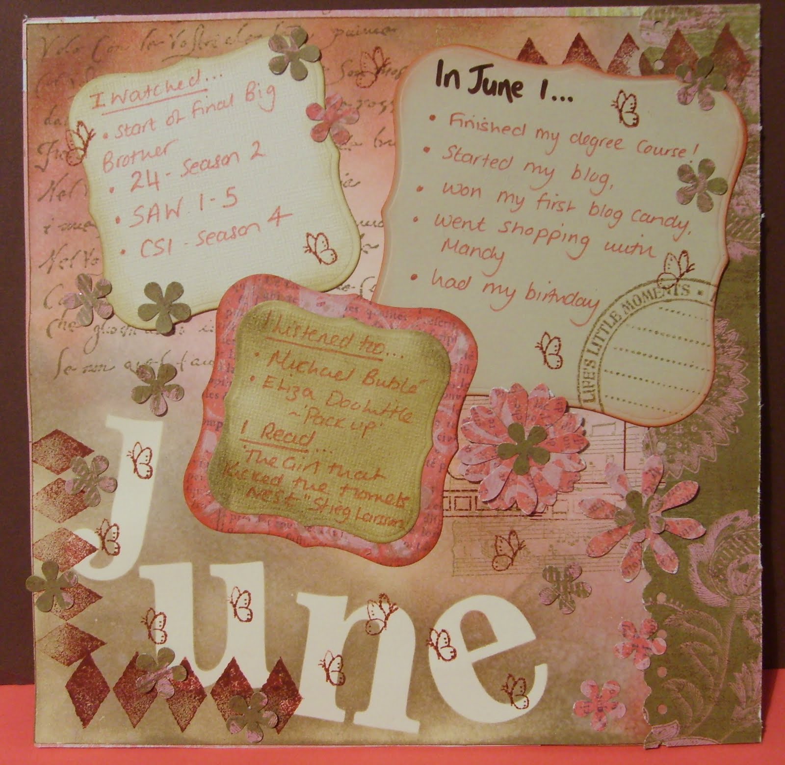 Oh my - what a difficult time I had yesterday - definitely distinct lack of MOJO, but am trying really hard to catch up with my scrapbook - it being September and I'm only on June! I wanted to do a page about what I was watching/listening to/reading etc during June, but found it really hard to do a page without any photos. This is what I ended up with - I used my nesties to cut journalling blocks, DI on my Background paper, and added some stamping and punched flowers. I'm not at all sure about it but, with nothing to lose I'm going to enter it into the Penny Black at Allsorts challenge 'Punches' anyway (the Harlequin and butterfly stamps are Penny Black).