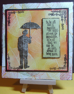 My next project was also inspired by The Stamp Man but this time the 'Autumn' theme challenge. These are colours which I don't normally use so it was a good project to get me thinking - I used a skeleton leaf stamp from The Stamp Man and distress inks to create two different BPs and then delved into my new TH stamps for the umbrella man image, corners and sentiment. I distressed and inked the edges of the papers before layering them up keeping it fairly simple to let the backgrounds stand out. I have to admit this man was one of the images I couldn't see myself using, but actually he seemed to fit this card, which for me evokes thoughts of the Autumn arriving and the approaching end of another year - I think he is staring out from his umbrella contemplating. Blimey I seem to have returned from my hols all reflective and thoughtful - that won't last !!
