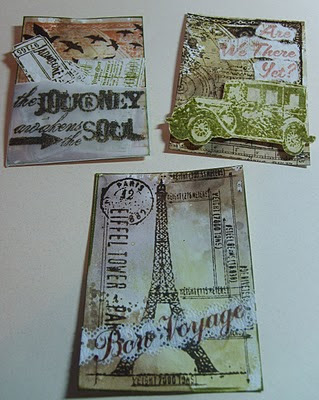 And here are the finished ATCs - the stamps are all TH except for the Antique Map I've used on the two at the top which is from The Stamp Man, and the 'Are we there yet?' phrase (not sure where that's from). The Bon Voyage phrase is a sticker I've had hanging around for ages.