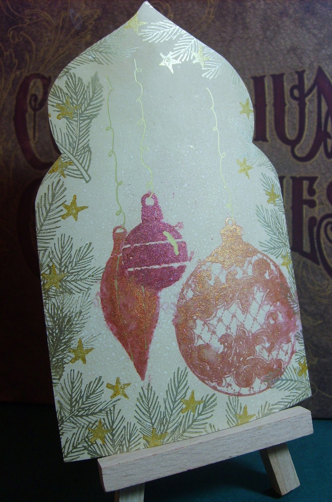Gothic Arch Challenge blog which is currently 'Baubles'. The large bauble stamp is one of my oldest and favourite Christmas stamps, by PSX , not sure about the little two. The pine branch round the outside is from Judikins Winter Botanical Cube and the tiny star is from Hero Arts.