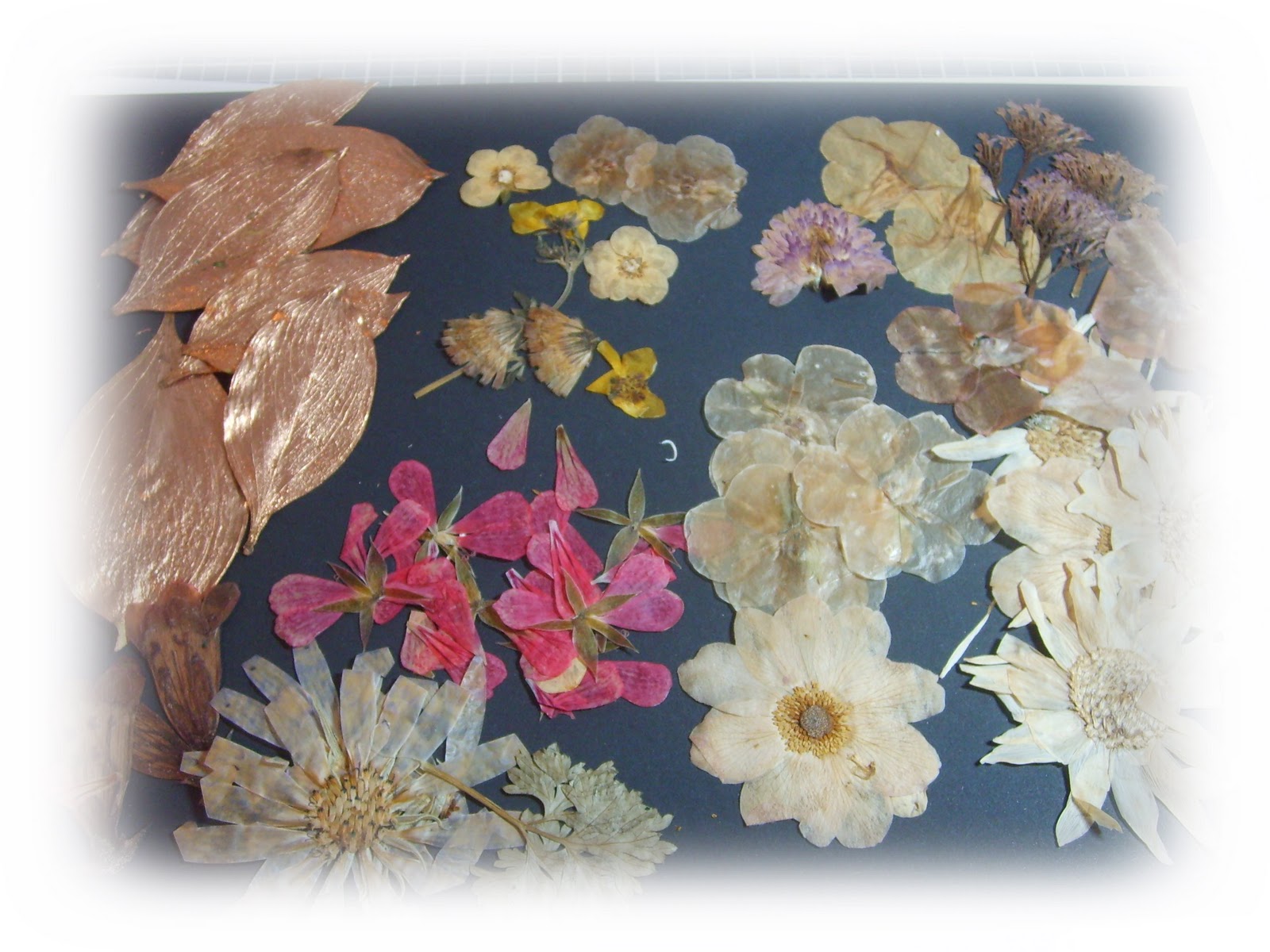 I had a lovely time at my mum's yesterday eve - she's clearing out their loft space and had some of my things stored in  boxes which she wanted me to sort through. I found all kinds of things I'd forgotten about like old school reports, books, dolls and jewellery.  I even found some crafty bits and much to my very patient other half's dispair brought them home with me. So on my Work desk today are some pressed flowers I came across in the rummage. Now these boxes I sorted through have been at my parents house for about 8 yrs so these flowers are at least that old - amazing that they've stayed as intact as they have and the colours are still lovely.