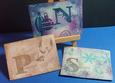 I've combined this with the Play Date Cafe's challenge this week which is to use the colours inspired from this gorgeous pic. I absolutely love this colour combination so set to work with my Distress inks and glitz sprays. I've used Penny Black 'it spells merry xmas' and dove stamps. I don't know where the baubles or swirl are from, the snowflakes are Forever Friends and elusive images. I made the backgrounds by smooshing distress inks on a craft mat and spritzing them with glitz spritz which gives a lovely shimmery finish which you can't see on the pic. The words are heat embossed also which doesn't really show and the Peace ATC is actually milled Lavender and Pumice stone so is much more lilac/grey in reality...pretty naff pic really isn't it !