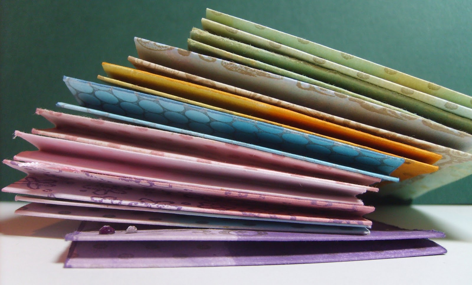 I wanted to use Distress inks as I love the colours but had used fairly cheap card (running out of the good stuff) which doesn't take D.I.s very well but is sturdy enough for this kind of project. So I brayered the ink on which gave a good coverage and I was able to get some two tone effects. I then used my Hero Arts Cling Polka Dots stamp on most of them - the other stamps used are from Artistic Stamper, Hero Arts, Penny Black and a couple of random clear stamps I've lost the details for.