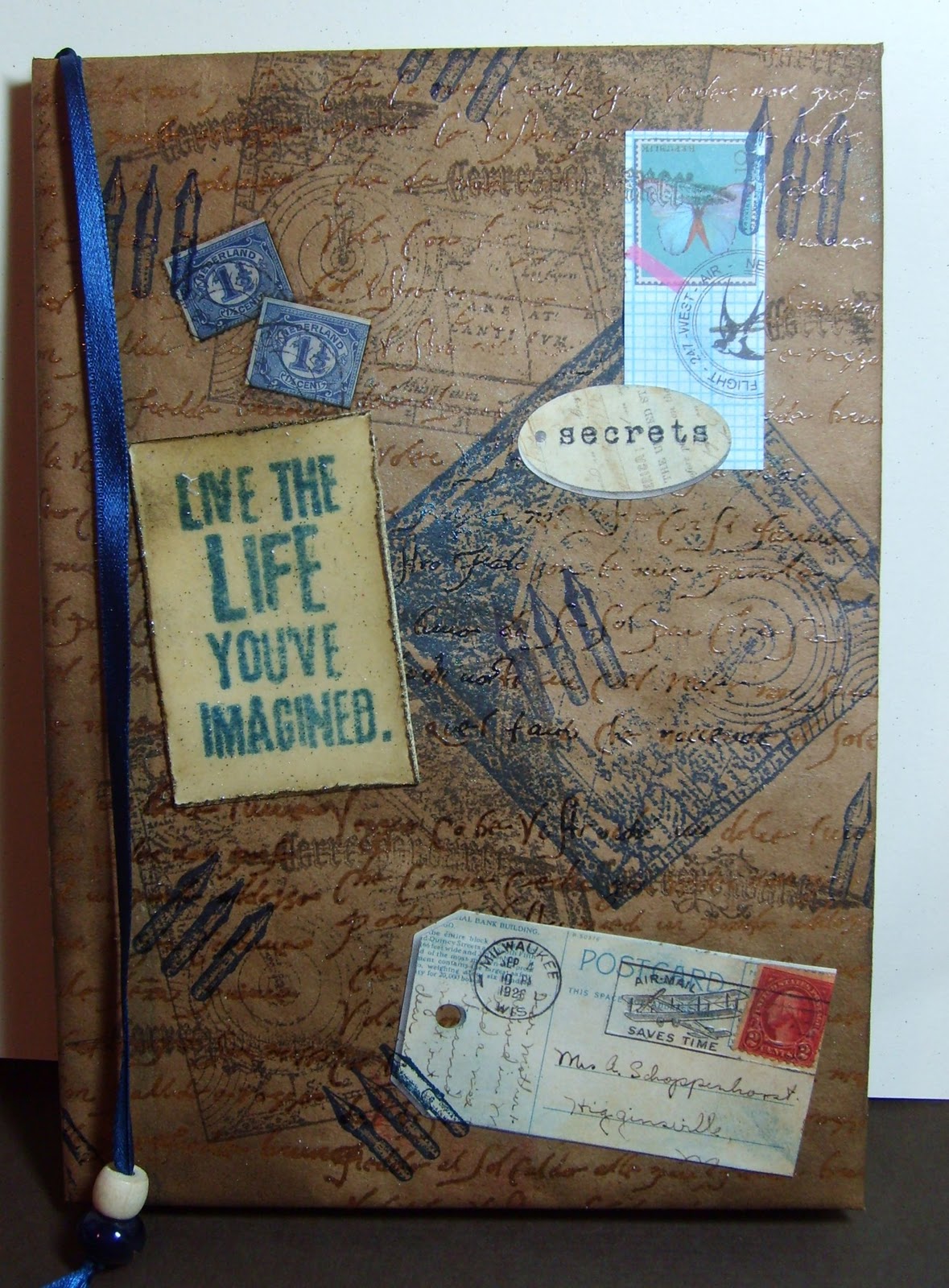 So I went about altering an old unused 2010 diary to store my completed Postcards in - I always said there was a reason to keep it. I covered it in ordinary brown parcel paper and then went to town with my stamps - including 'Antique Map' from The Stamp man and 'Italian Script' from Judikins, and some postage themed bits and bobs.