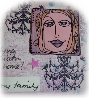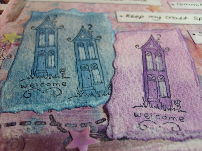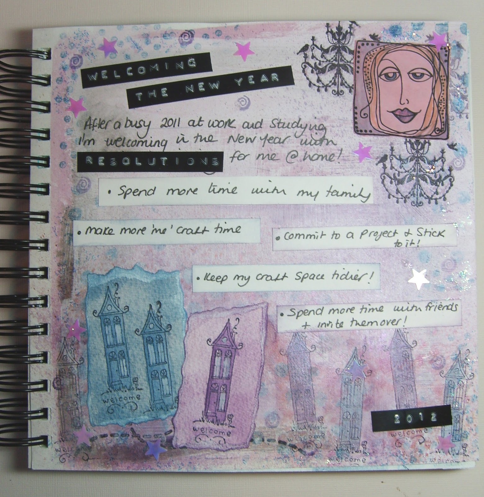 I kind of lost track of what I did to the page - I started with a layer of Gesso and added distress stains and then just spritzed, inked and used some background stamps til I was happy. I added the stamped houses, both directly to the page and on torn scraps which I inked. I used a couple of free Craft Stamper magazine stamps - I don't have chandeliers in my home but thought they added a bit of glamour - and I only look like this first thing in the morning ! I added a touch of sparkle round the edges and some shimmery stars just to give it that New Year celebration feel. I also used my 'new from santa' Dymo label machine - it's only one of the basic embossing ones but I love it and anything that stays still long enough gets stuck with a name tag!