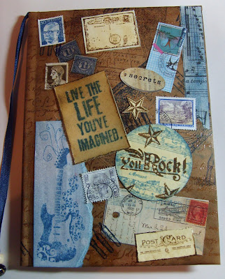 So - Darcy has announced the first country on our year long Postcard challenge adventure and I have spent a glorious day getting inky and messy and creative. We're not allowed to share the finished Postcards til Friday but I can show you the book I've made to keep them in. I did share this a while ago but I have done some work on it since as I wasn't happy - so here it is (again).
