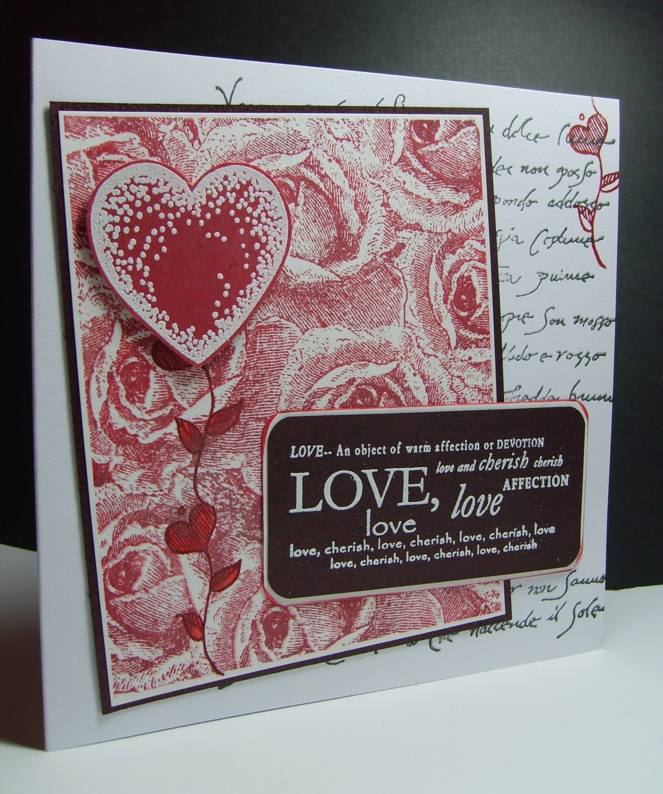 I stamped the etched rose background in Stazon Black Cherry, embossed the sentiments and the free heart stamp from Craft Stamper in detail white. The script on the base card is Judikins Italian script - one of my fav stamps!