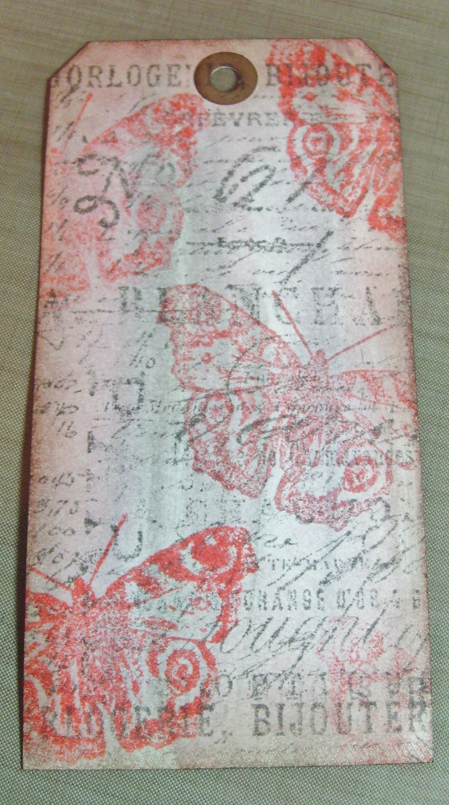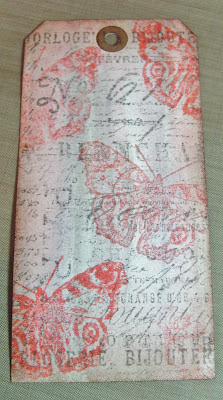 I've used another technique to make the tag background, inspired by "Just us Girls" who's challenge this week was to use generational stamping, which I've done with this Butterfly stamp.I've used Pumice stone and worn lipstick Distress inks.