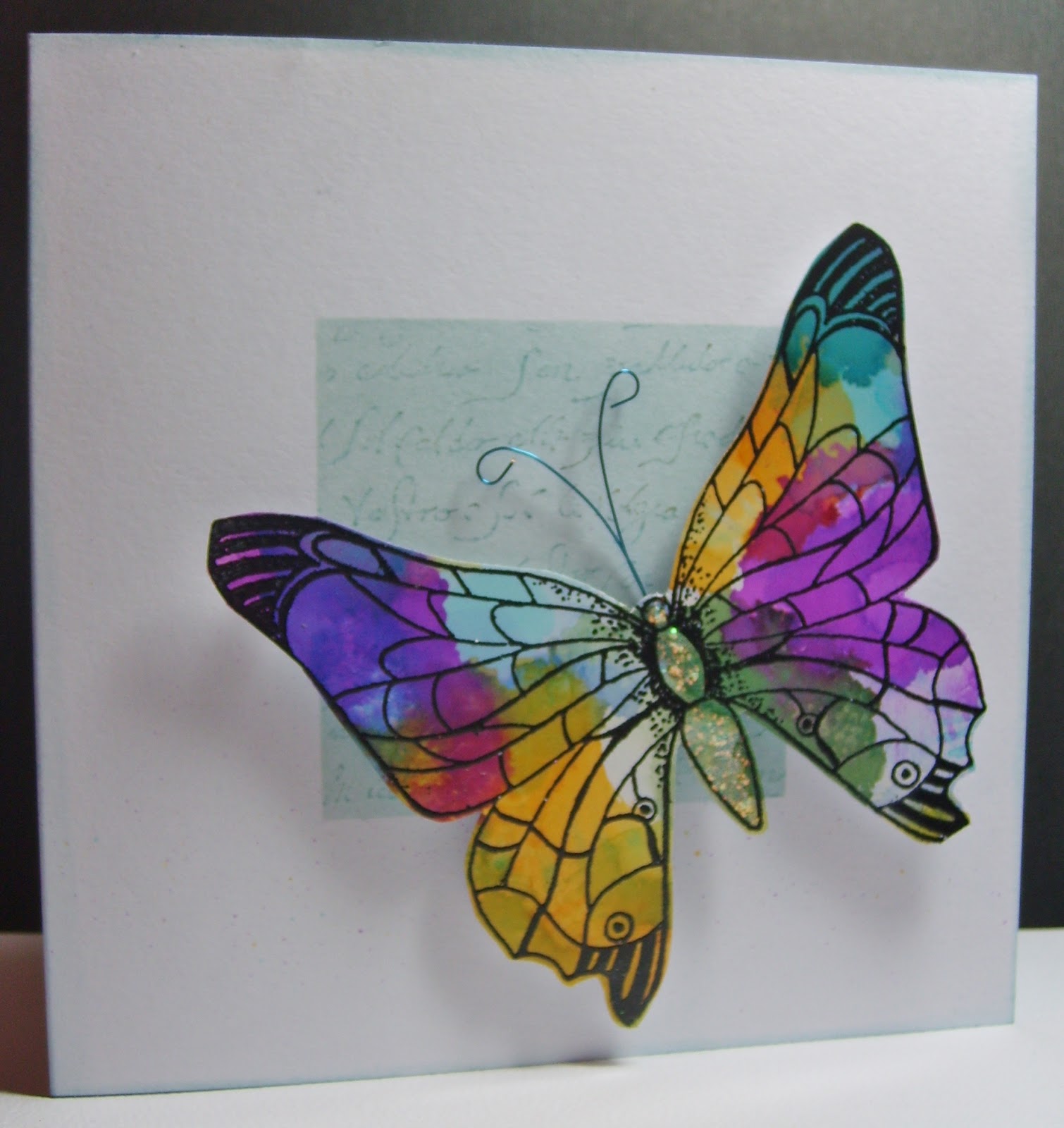Both Butterflies were stamped and embossed onto glossy card that had been coloured with alcohol inks. On the top card I masked a square, coloured with distress inks and stamped with Judikins Italian script stamp (one of my all time favs!)