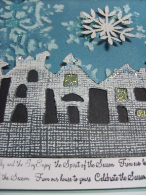The houses are die cut from whitewash co-ordinations cardstock and gently sanded, I then mounted the strip on a piece of plain black card and added glitter to some of the windows. The wording along the bottom is a Kanban stamp.