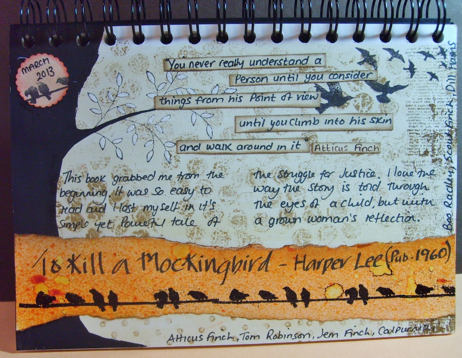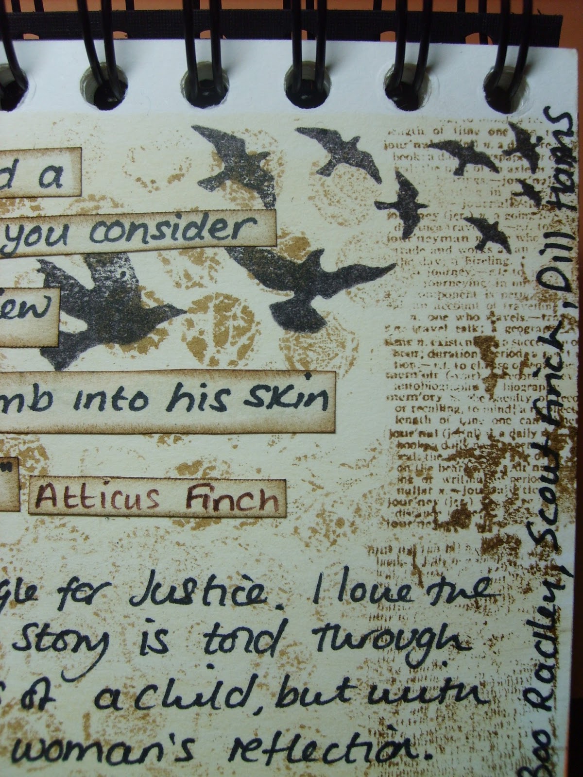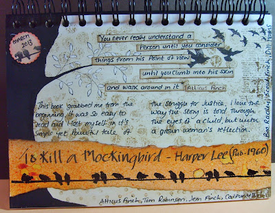 It's the first page in my book journal - the cover of which you can see here. I'm going to create pages inspired by some of the books I read and having just recently finished 'To Kill a Mocking Bird' here is where I started. It really is one of those books everyone should read at some point. I've used inspiration from the book cover and painted a tree, stamped some leaves and created the background with distress stains, bubblewrap printing and a polka dot stamp.