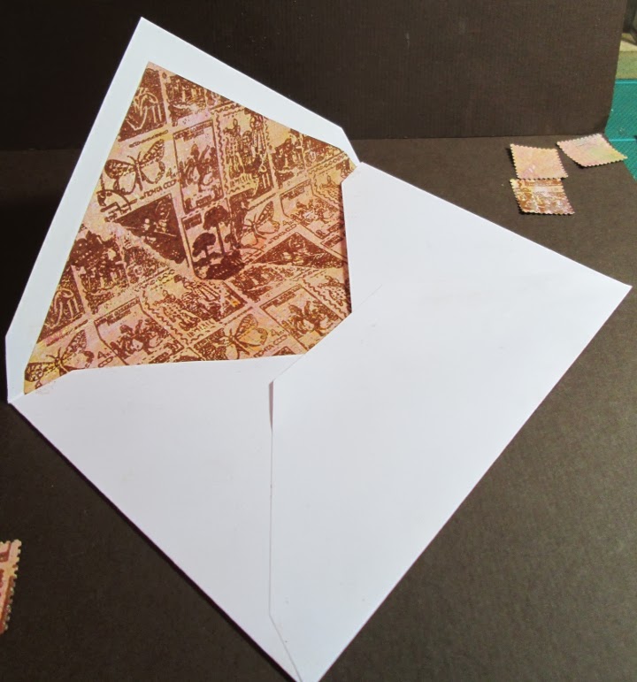 I created a lining for the envelope by using the same stamp on a sheet of paper previously printed on my Gelli plate (still loving this glorious messy process!!) - by coincidence this was a page from an old stamp album so even that fits the theme !