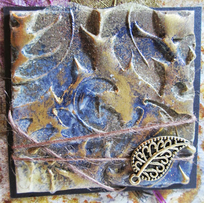 So I started with that and decided I didn't want to cover it up because I liked it too much (even if I do say so myself :-) ) so I went with a UTEE Twinchie, behind which I added some skeleton leaves. I used clear UTEE and added pearl violet and gold embossing powders to the top layer before stamping into it while still warm and liquid with a leaf stamp (from ebay, no idea of manufacturer). I added some touches of rub n buff, a little leaf charm and some twine.