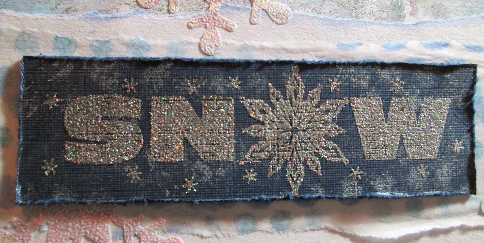 I've created the background with distress inks, torn paper and die cuts. The Snow stamp is from a set by Stamp Addicts - Snowflake Splendour, here. Which I've embossed with Judikins Diamond sparkle EP.