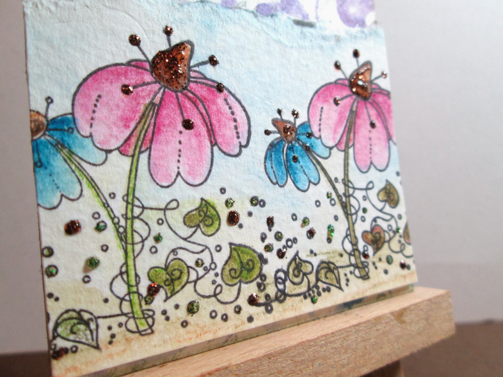 I then stamped a little flower stamp (freebie from craft Stamper mag) and coloured with Derwent water colour pencils, adding stickles for a bit of sparkle