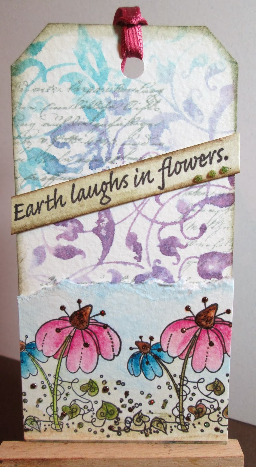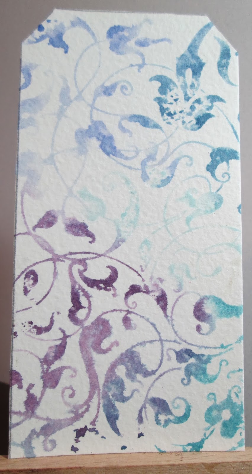 I used a couple of techniques to make a tag. First of all I used the 'brush less water colour' technique - inked a background stamp (Judikins) with distress inks, spritzed with water and stamped onto water colour paper.