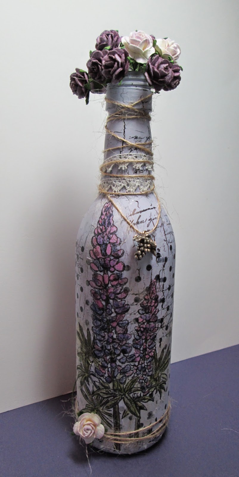 Once the paint was dry I stamped Hero Arts polka dots and TH script onto the bottle before applying the tissue paper stamped image with Glue and Seal. Then it was just a case of finishing off with some lace, twine, a charm and roses.