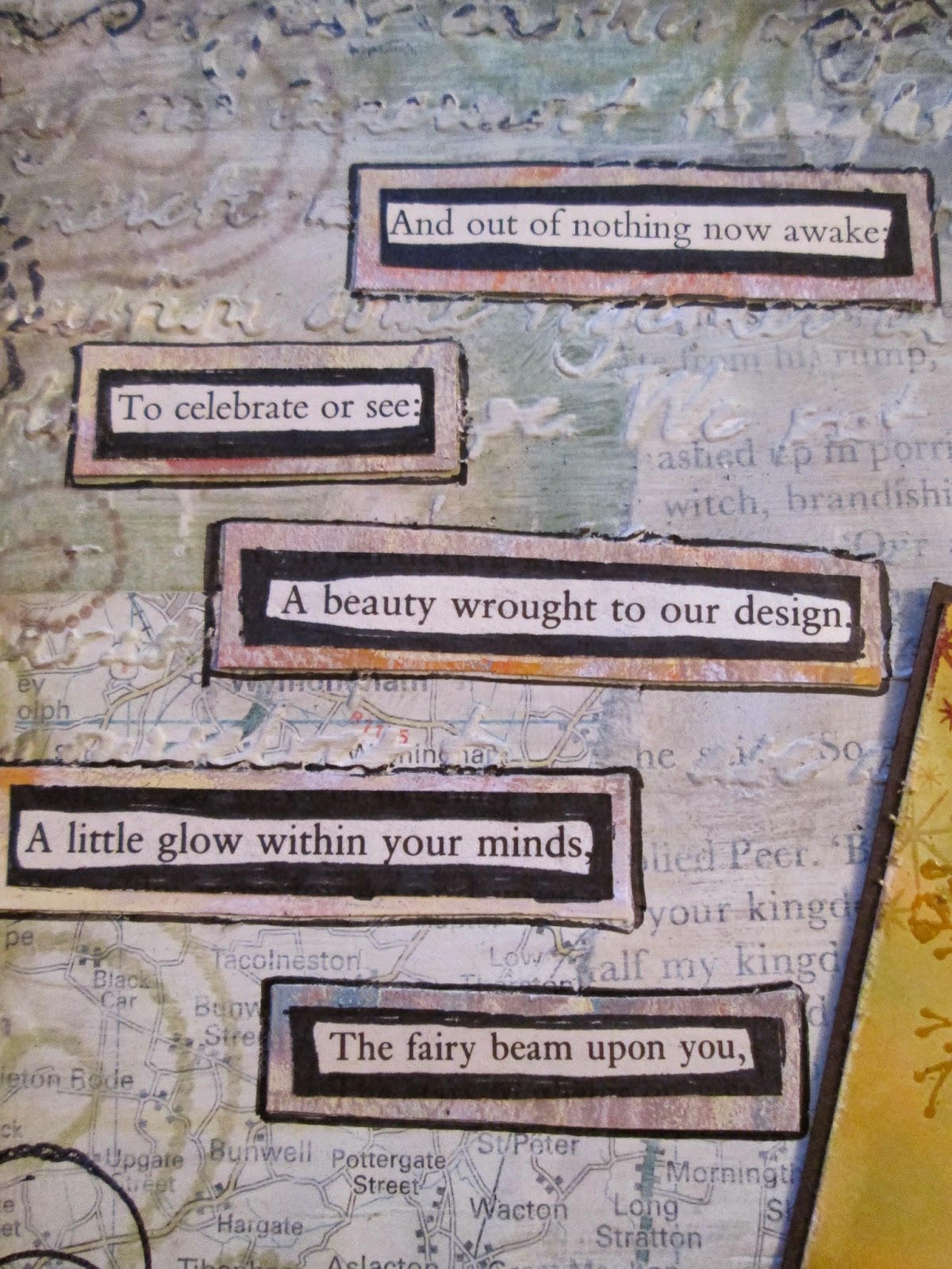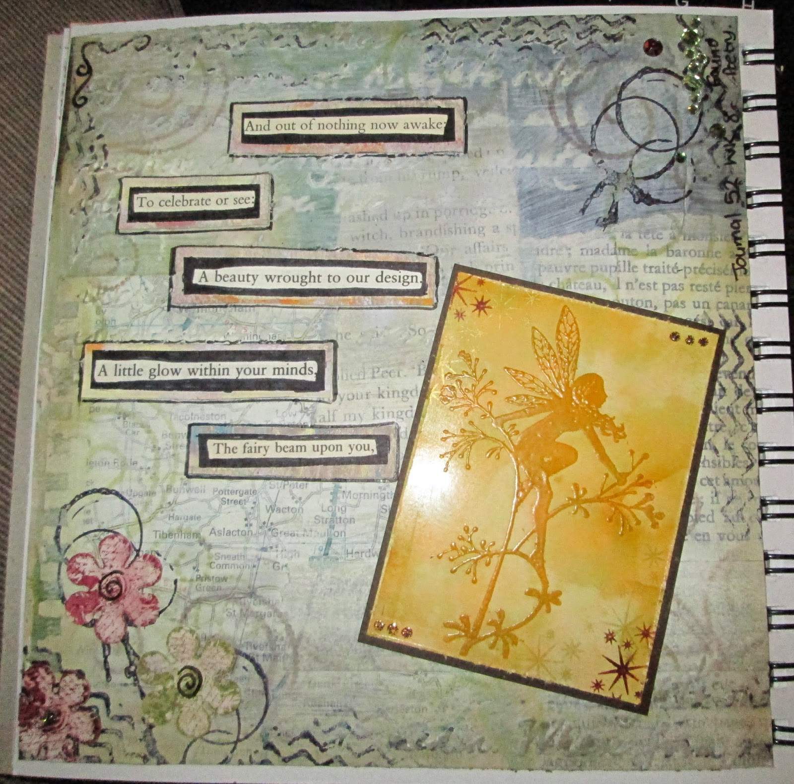 According to Poets.org, “Found poems take existing texts and refashion them, reorder them, and present them as poems. The literary equivalent of a collage.... " The background for my page started as a gelli plate print but I wasn't happy with it so I collaged some scraps of various papers over it, to which I applied a wash of gesso, distress stains and inks, some grunge paste through a stencil and finally some stamping. My 'poem' is lines cut from different actual poems and the fairy image is stamped (Lavinia Stamps) and clear embossed over an alcohol ink background.