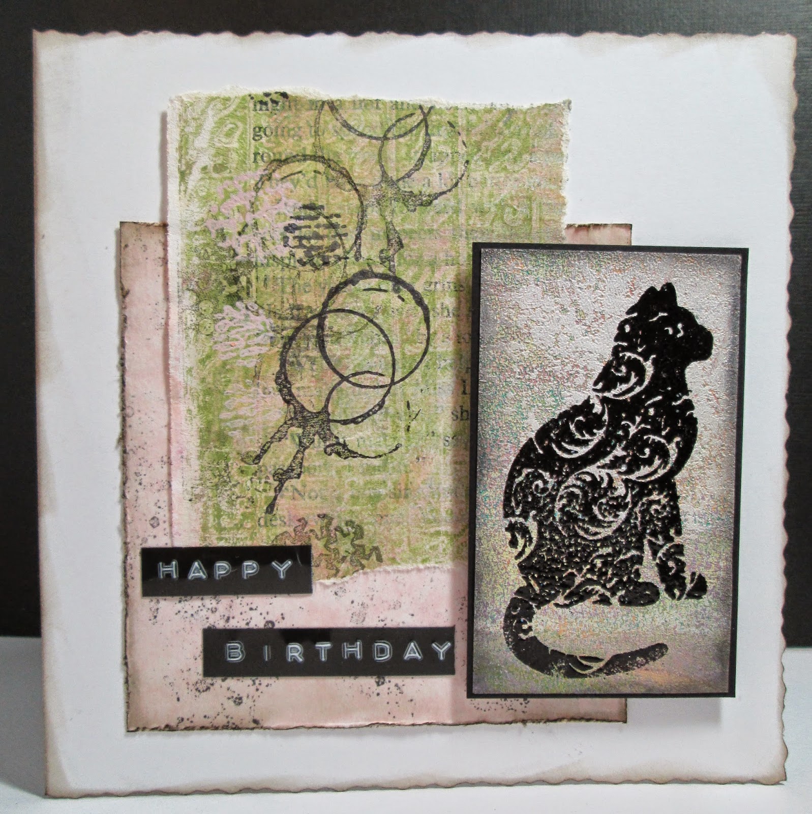 Well it's been a while since I was here having had a little break while I had some tricky stuff going on. But I'm back with my team mates from Craft-Room to join the latest challenge from our newest roomie Christi. She has chosen 'Cats' as our theme and I've made a grungy birthday card -