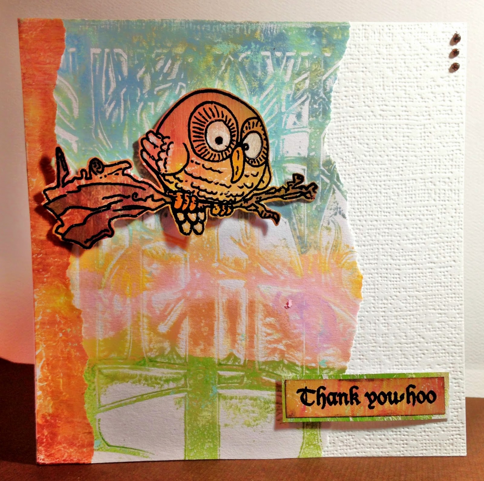 I used a Gelli plate print for my background - one made using a lovely tree stencil from Clarity Stamps, and then added this cute little owl which is by Stamp Addicts .