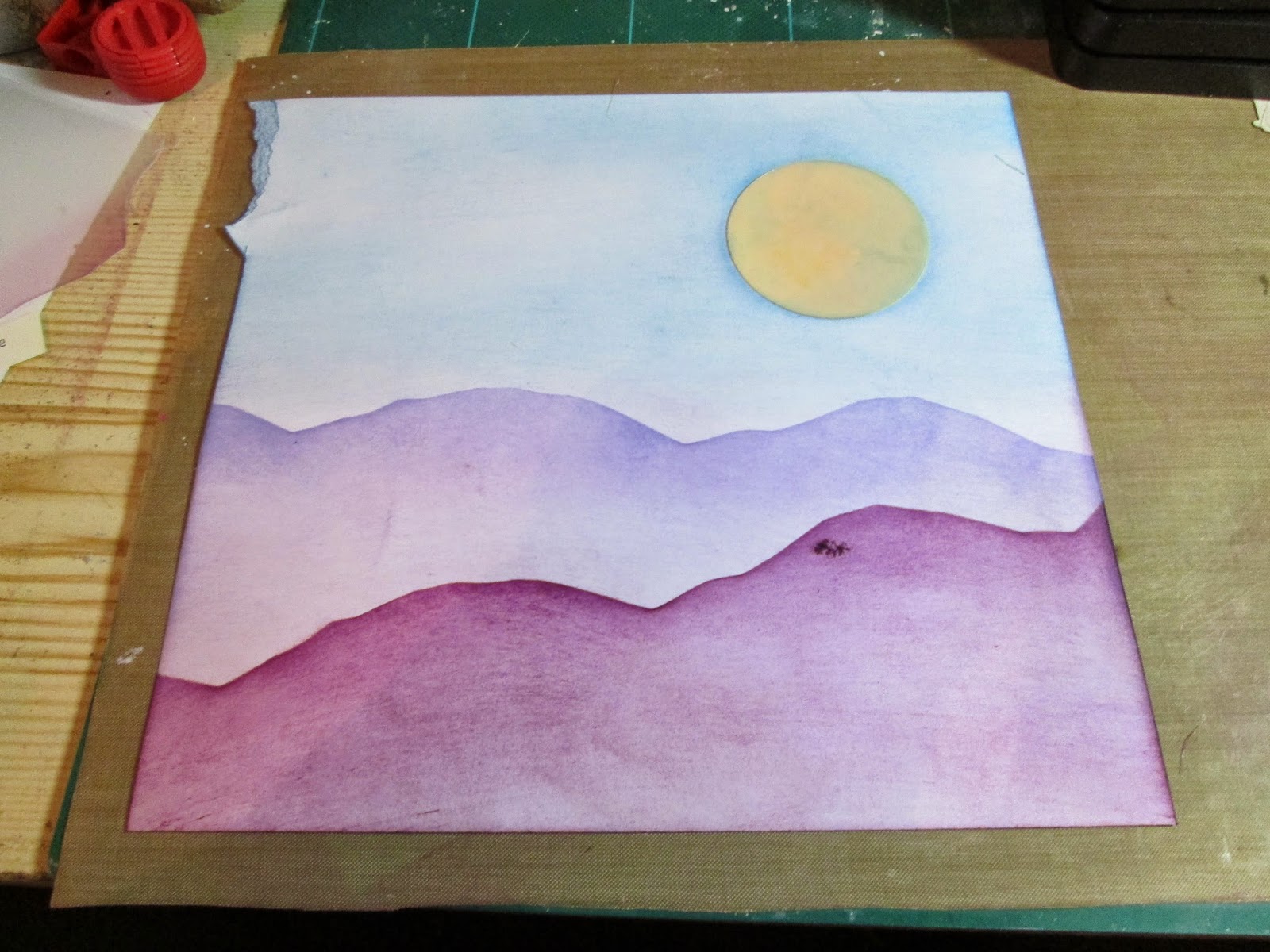 The sky is tumbled glass and stormy sky, sun is scattered straw, wild honey and mustard seed. The landscape first layer is milled lavender and shaded lilac