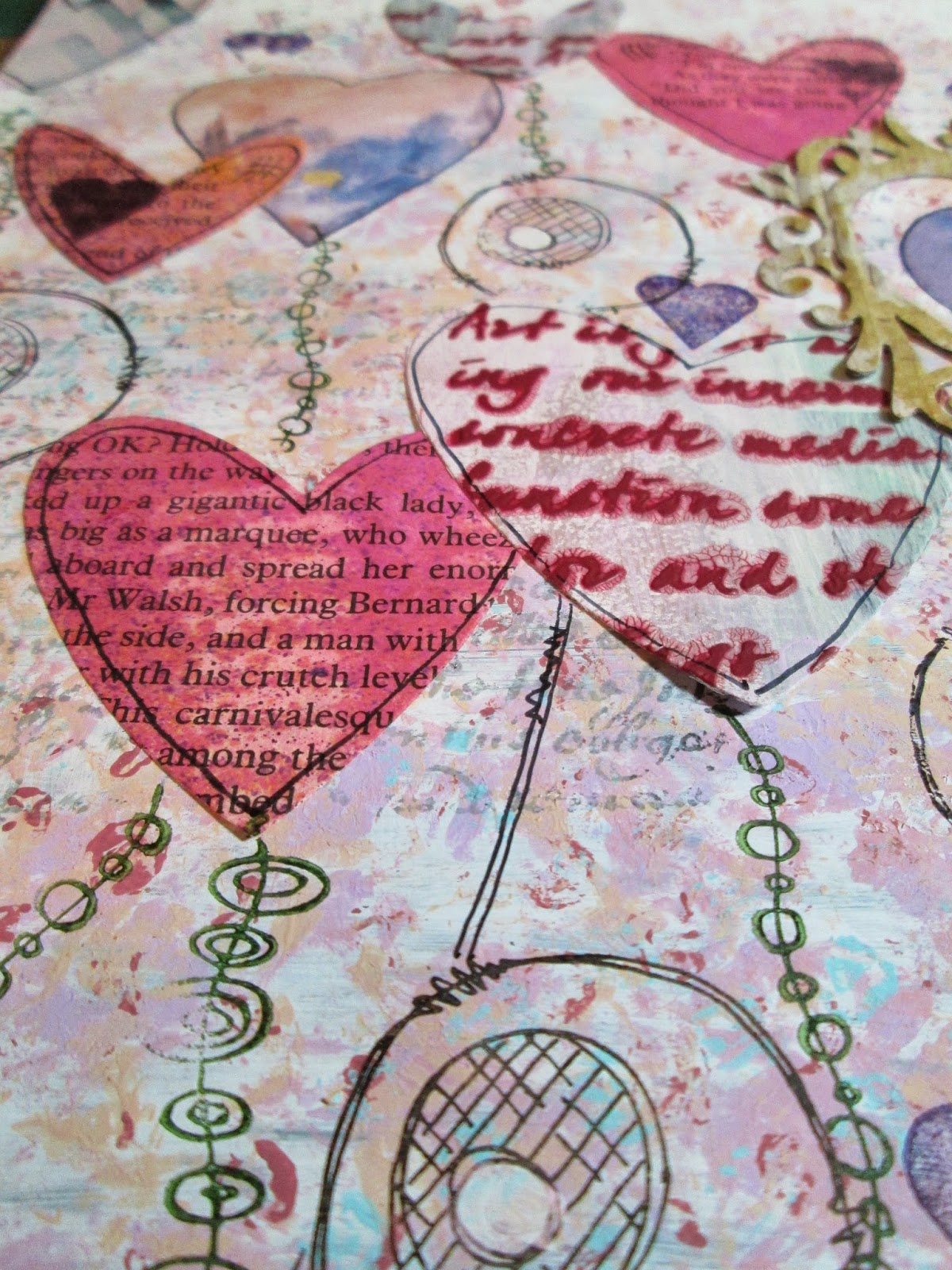 I masked three heart shaped areas and slapped on the gesso - followed by assorted colours of acrylic paint which I 'stamped' with bubble wrap - with both large and small bubbles stamped an Artistic Stamper script stamp then removed the masks.