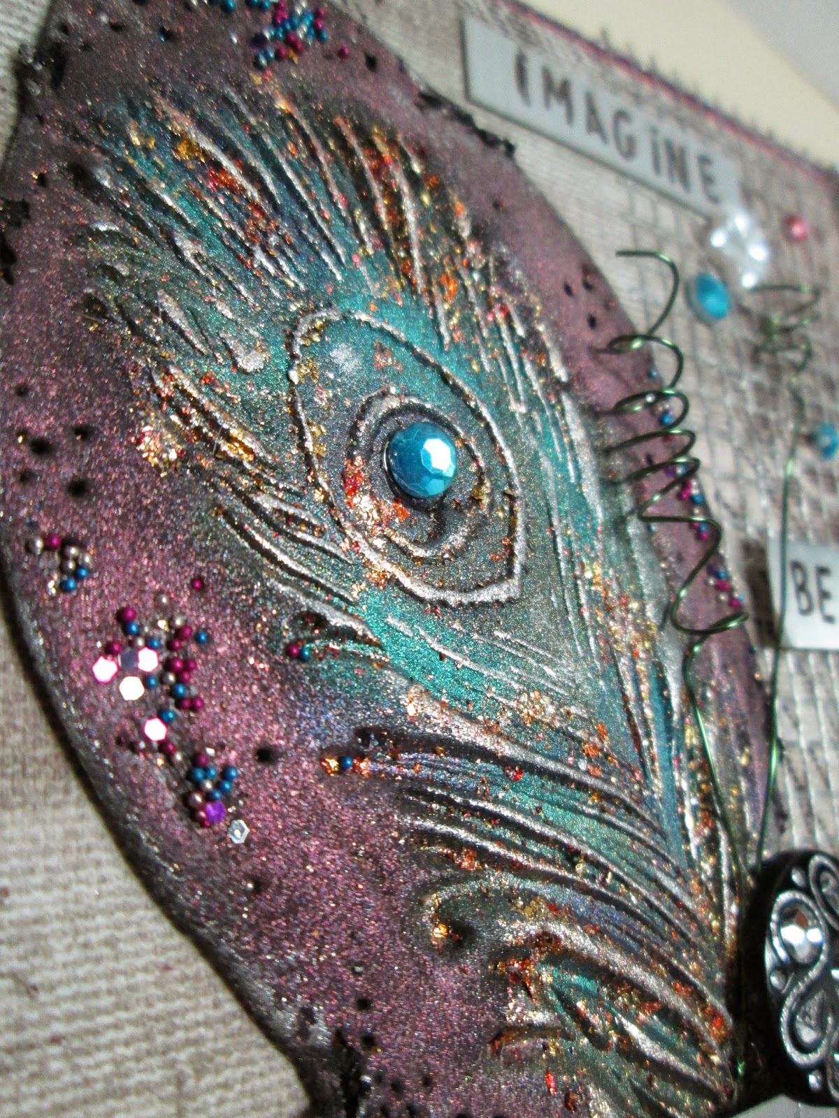 The latest challenge over at PartArtsy is Shiny Stuff - metals, mica, beads, wire, jewellery, paint effects, Treasure Gold, in other words, all things shiny, rusty or metallic. This is waaaay out of my comfort zone but as my learning continues in the world of mixed media I've had a lovely time experimenting. I had some black cloud clay (goodness knows what I bought it for originally) and so inspired by Lin Brown's post played about with that and stamps, perfect pearls and tiny beads. The first couple of attempts were not great but the third one I was happy with - I couldn't decide what to do with it until I found an old wooden block that I'd removed the rubber stamp from (storage issues!!) and this is how it ended up -