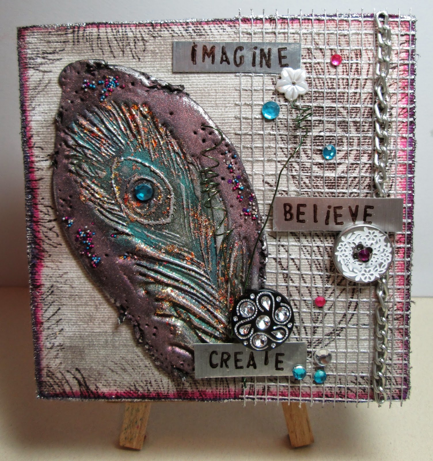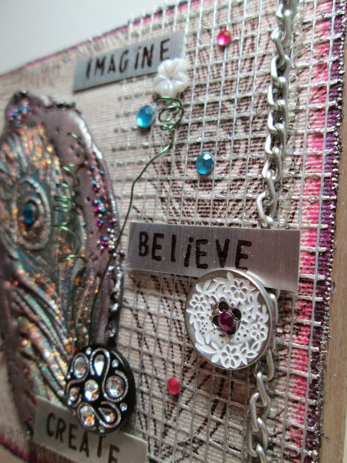 For the background to my clay piece I stuck a piece of sticky back canvas onto the wooden block and coloured with pumice stone and milled lavender distress stains, then ran picked raspberry and seedless preserve and touch of Treasure Gold (silver) around the edges. I stamped the feather in Stazon 'ganache' (love this colour - just a bit softer than black) and added more shiny things ! The words are stamped in Stazon (yep Ganache!!) onto strips of silver card. This is so far outside of what I normally create and I've loved doing it !! Thanks for stopping by - Happy Crafting....Esther xx