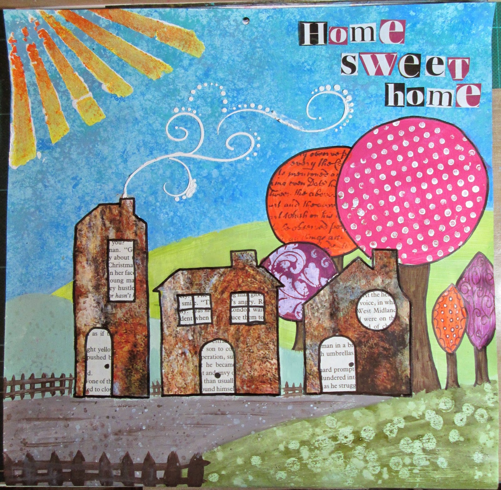 I masked off the houses and set to with my acrylic paints. I've used the wax resist technique on the green at the bottom - colouring through a sequin waste stencil with a white crayon over pale green paint before adding a wash of forest moss distress stain which resisted the crayon.