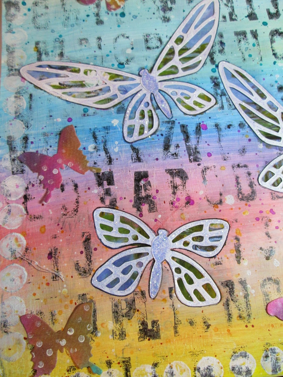 I started by die cutting butterflies using Tim Holtz die on which you get a solid die cut as well as with cut outs. I used the solid pieces as masks before painting layer of gesso to prepare the page. Onto this I scribbled bands of gelatos which I then blended with water and a paint brush. For the repeating pattern I struggled to find a stamp I was happy with and ended up using an alphabet (Stamp Addicts) like Darcy did in Archival black ink. I also stamped a border of large dots (PaperArtsy) with white paint and added splatters of Dylusons ink sprays.