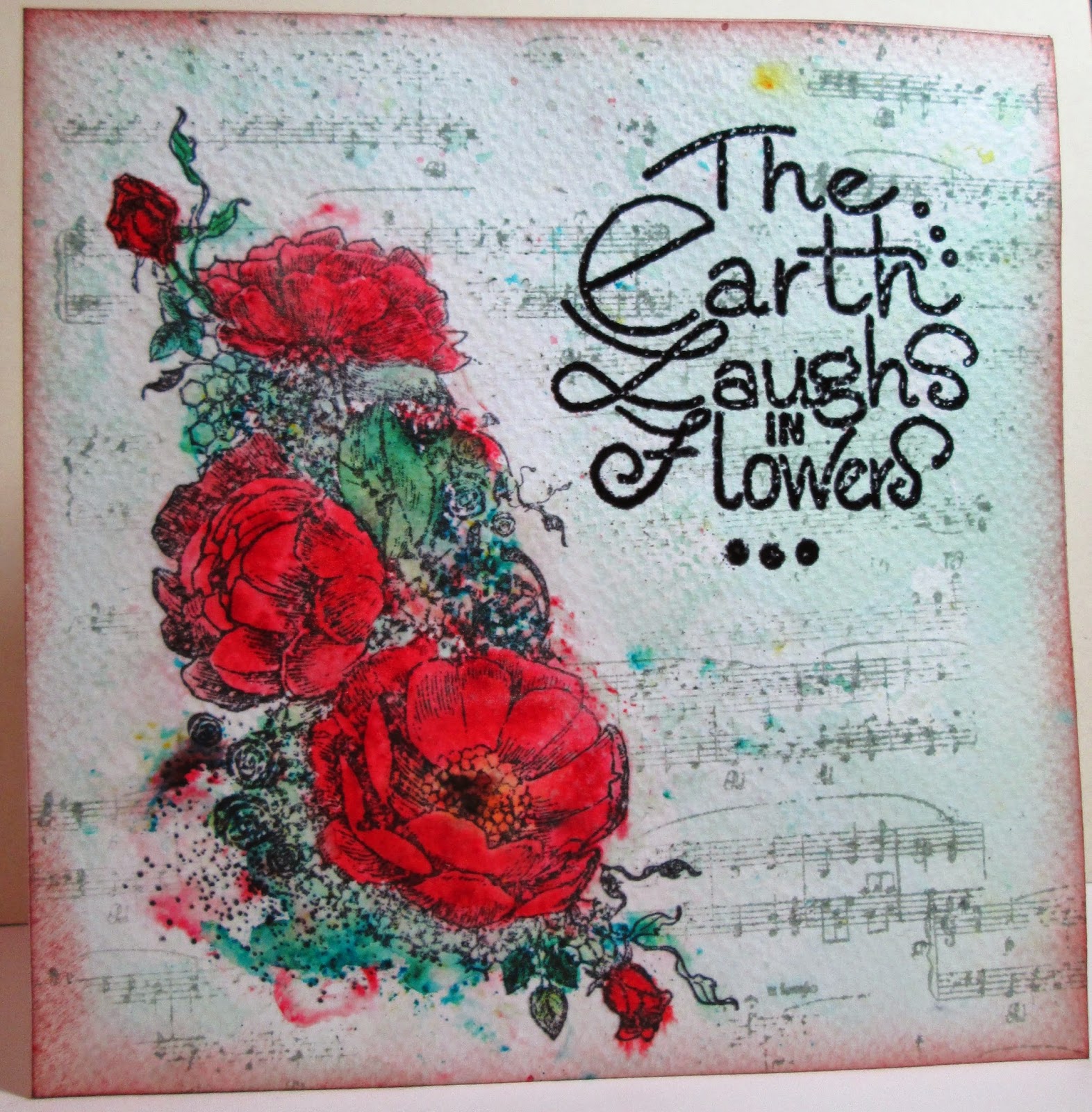 After stamping on watercolour card I painted the flowers and also sprinkled some Brusho around the edges of the image. Once this was dry I applied Micro Glaze to the painted area before spritzing the whole card with a very pale spray made from a tiny amount of Emerald Green Brusho. While this was still wet I added some additional sprinkled of Brusho in Emerald Green, Leaf Green and Brilliant red. Once all this was dry I stamped and embossed the sentiment and added background stamping before finally swiping round the edges with Barn Door distress ink.
