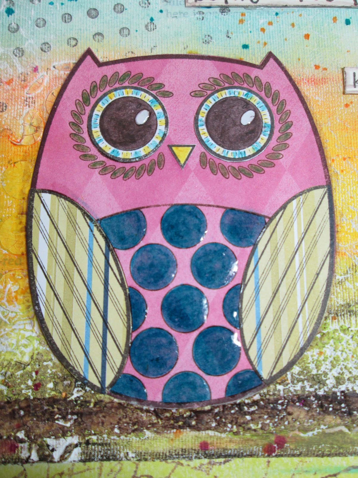 The cute owl is stamped on patterned paper and paper pieced, I coloured a few details with inktense pencils and added some glossy accents. A little banner across the corner and the stamped quote finished off the page.