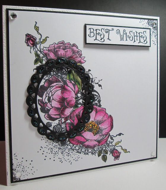 I then dies cut an oval mat and removed the centre with my craft knife to create a frame placing it over a section of the stamped image. I used the edge of the stamp to add some detail in two corners, stickles on the frame for a bit of bling and a stamped sentiment (The words are actually underneath each other on the stamp but I carefully cut them apart as I usually prefer this longer side by side style message.)