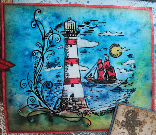 I've used a Kanban stamp set creating background papers which I've layered as a base for the main image which is stamped on water colour card and coloured with Brushos. A bit of cheesecloth for netting and some twine add finishing touches.