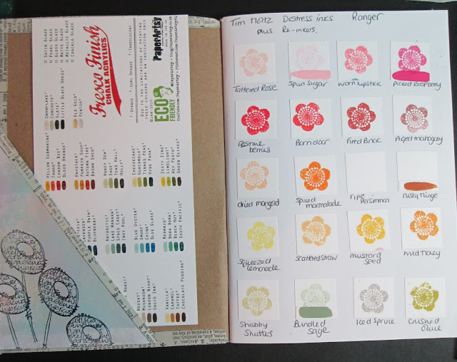 The words are from The Artistic Stamper and - yep stamped on a gelli print! After sticking on the circles and words I edged the covers in Tim Holtz tissue tape. I also added a little pocket inside the front cover for the PaperArtsy paint chart. You can see here the first page with colour swatches of Distress inks. I've also added colour samples of ink sprays, Inktense pencils, gellatos, stickles etc - pretty much all of the mediums I have several colours of.